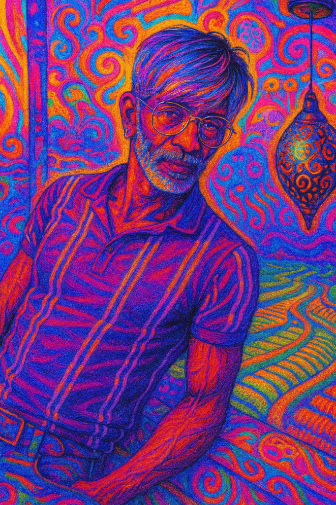 Everything was saturated in the most breathtaking, surreal colours: electric violets that shimmered like emotion itself, pulsing greens that vibrated with life, deep molten golds that wrapped around my spine like warmth, and blues — oh, the blues — that breathed, that seemed to hum in my bones like music I’d forgotten I knew.